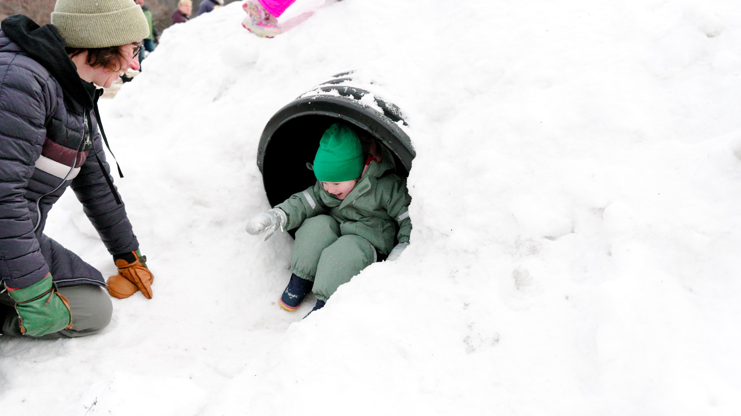 Winter captures the quiet beauty and energy of the colder months, featuring scenes of families playing in the snow, ski jumping, cozy coffee shops, local shopping, and the sense of warmth that defines the community even in the coldest season.